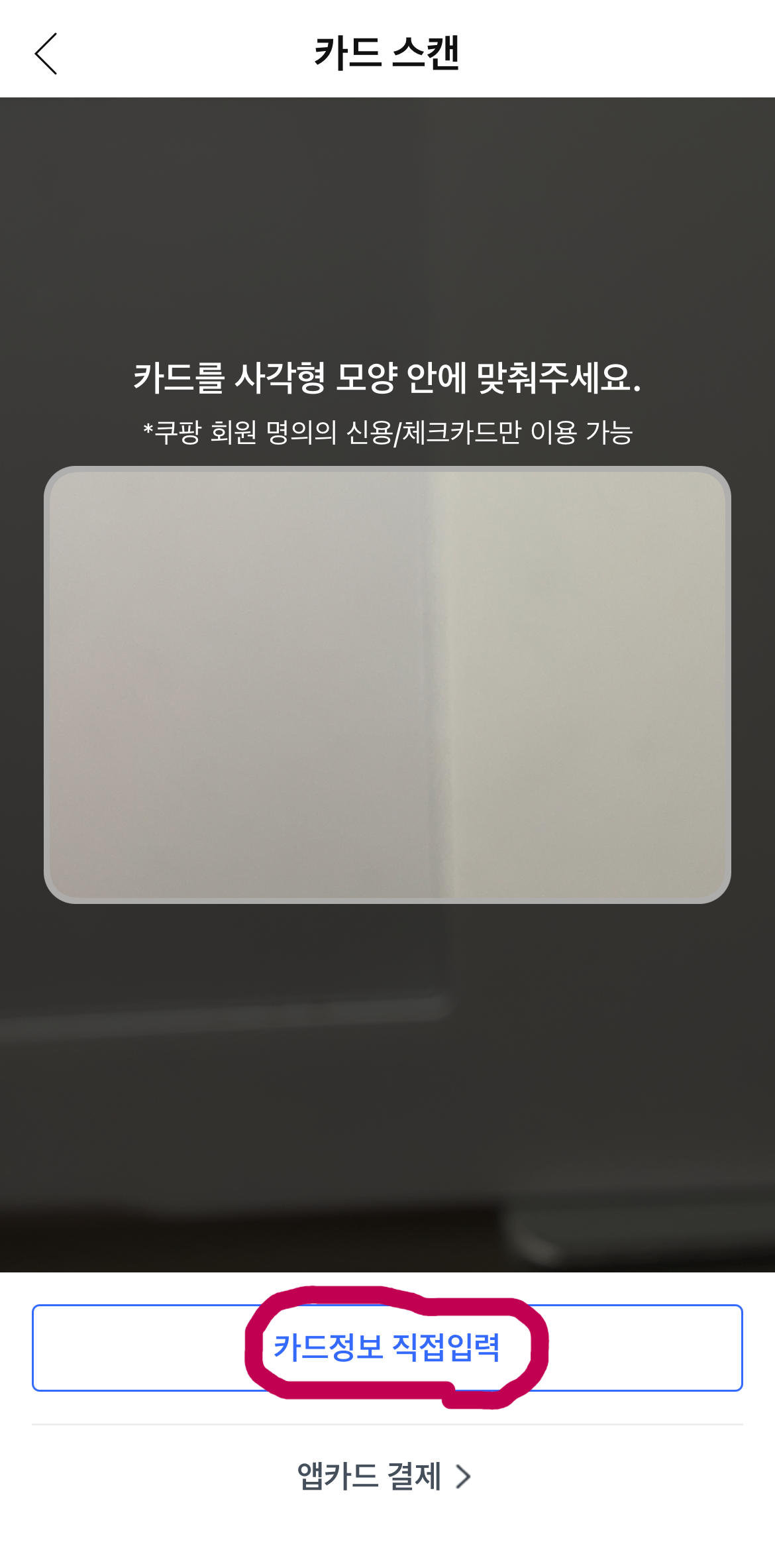 3. '결제하기' 선택하면 카드스캔기능이 뜨는데 '카드정보 직접입력'을 선택해요.