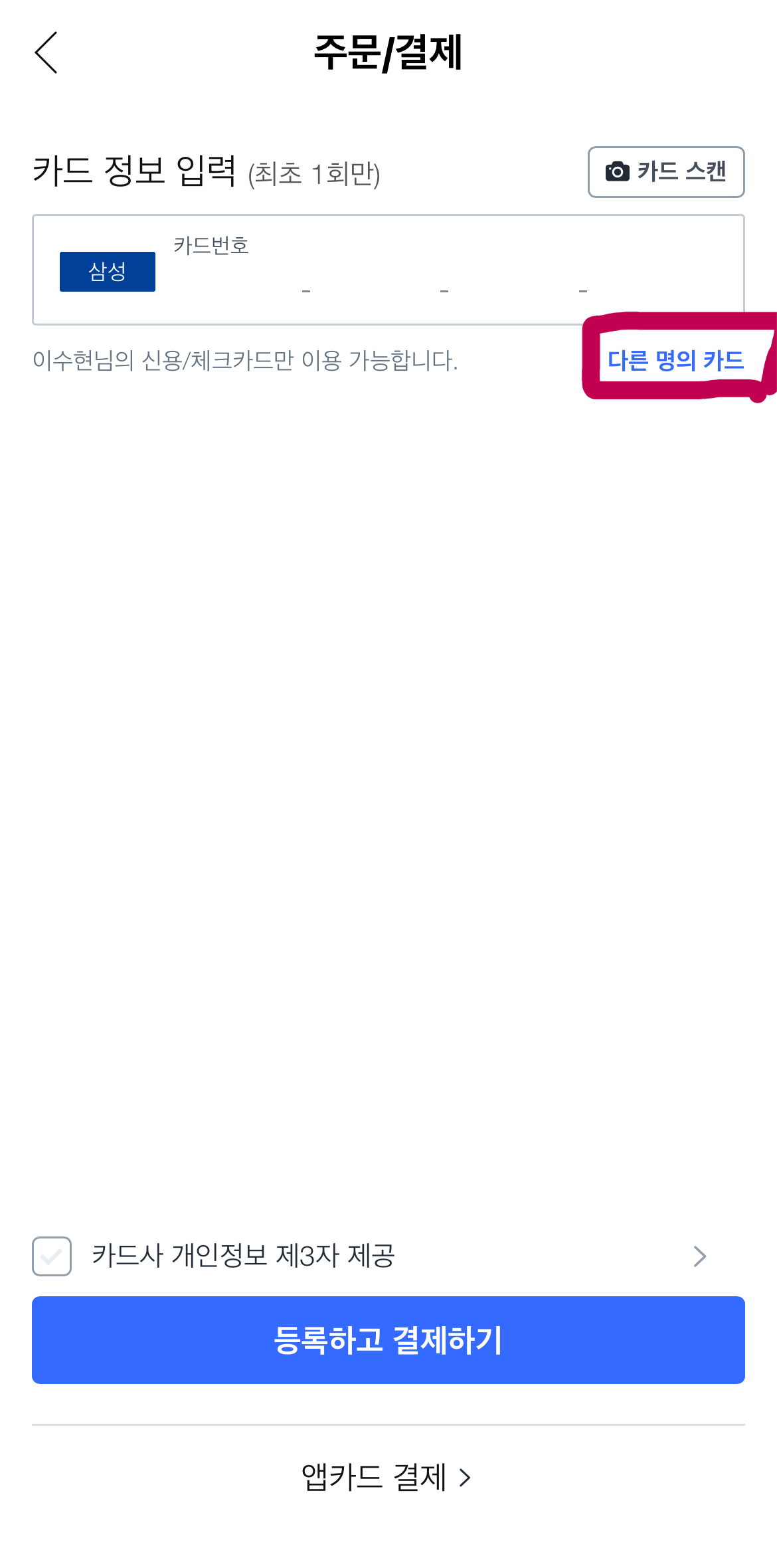 4. 오른쪽 윗부분의 '다른 명의 카드' 선택하고 다시 한번 '다른 명의 카드결제' 선택하여 카드정보를 입력 후 결제하면 돼요.