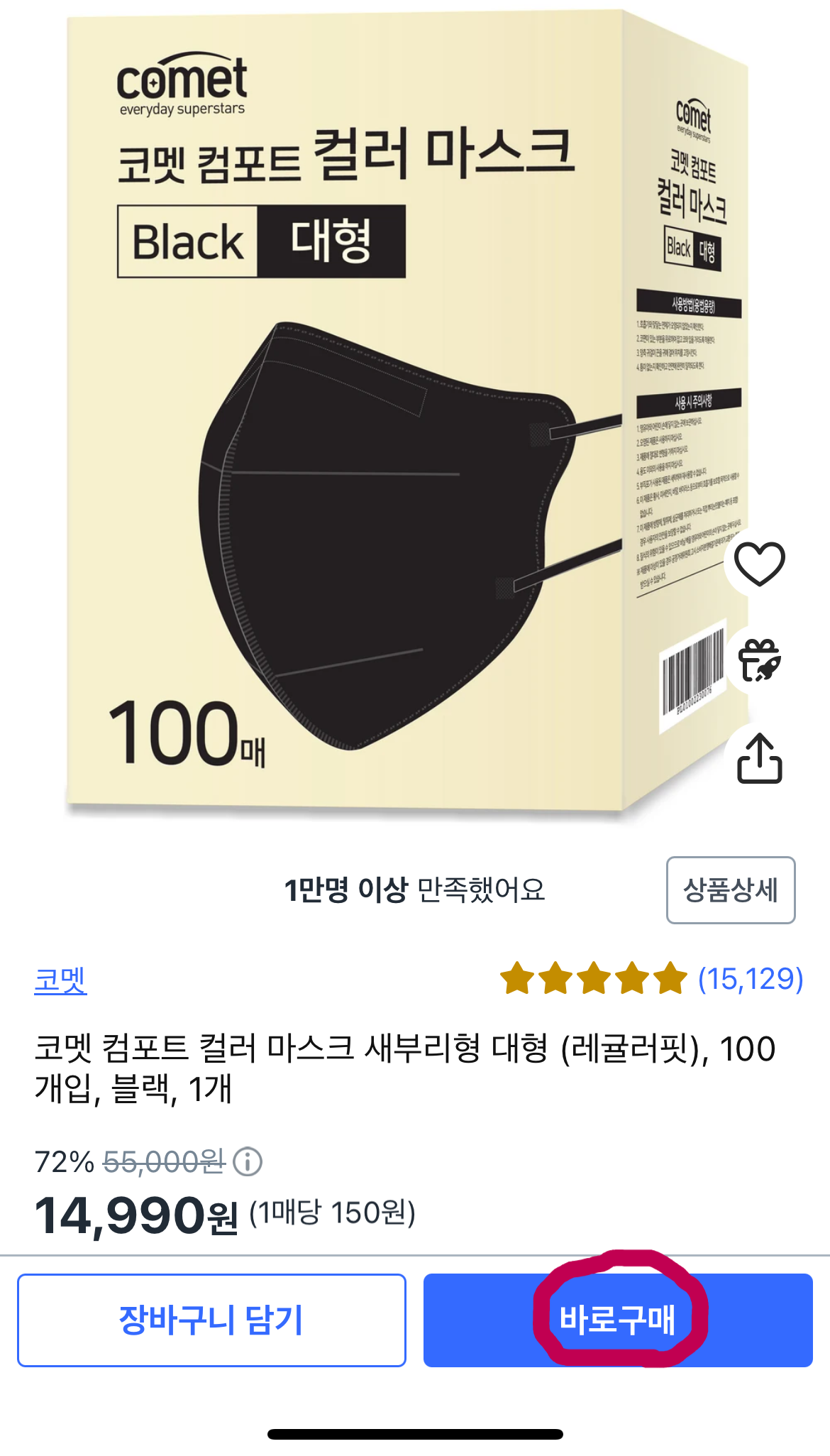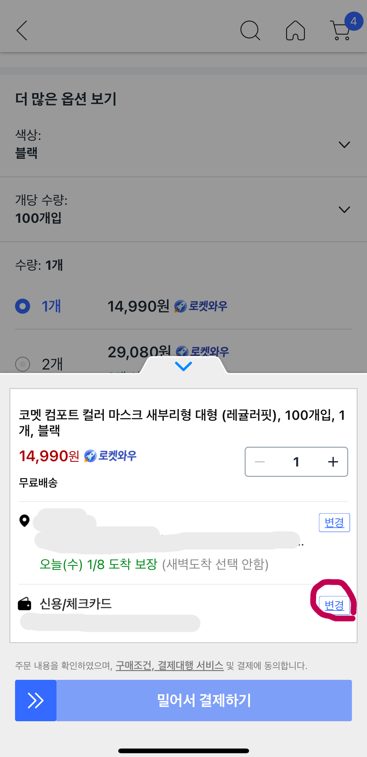 1. 상품을 선택하고 '바로구매'를 누른 뒤 [신용/체크카드] 부분의 '변경'을 클릭해요.