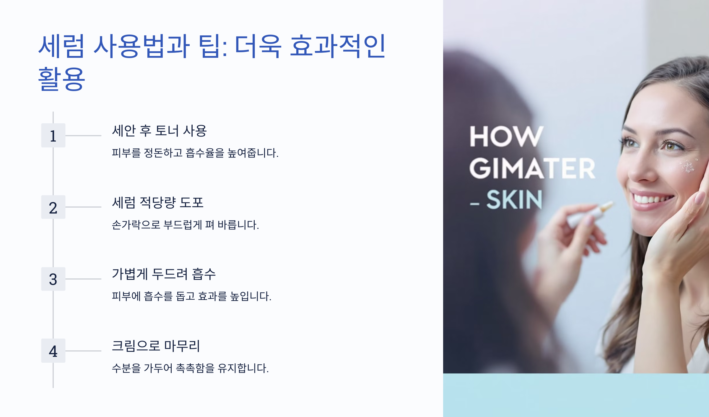 세럼을 효과적으로 사용하려면 올바른 사용법을 아는 것이 중요해요. 세럼은 기본적으로 세안 후, 토너 사용 직후에 발라야 해요. 이 단계에서 세럼이 피부 깊숙이 흡수될 수 있는 환경을 만들어주기 때문이죠.