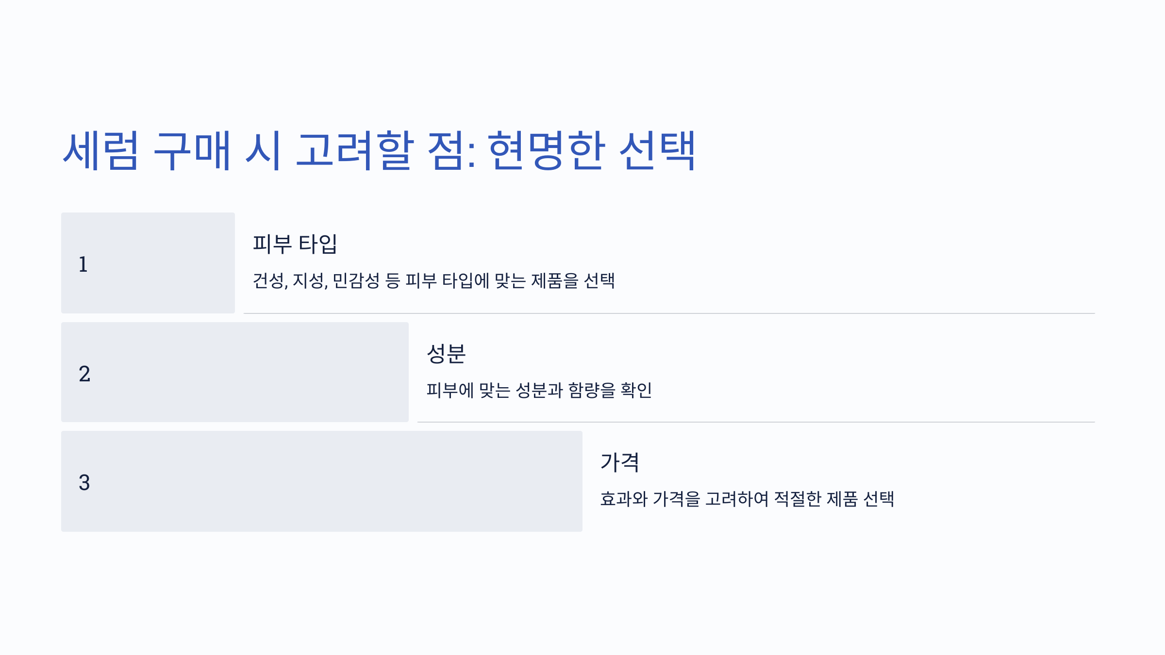세럼을 구매하기 전에는 자신의 피부 타입과 고민을 먼저 정확히 파악하는 것이 중요해요. 지성 피부라면 수분감이 가볍고 산뜻한 제형의 세럼을 선택하는 것이 좋고, 건성 피부라면 보습력을 강화해줄 세럼을 고르는 게 중요하답니다.