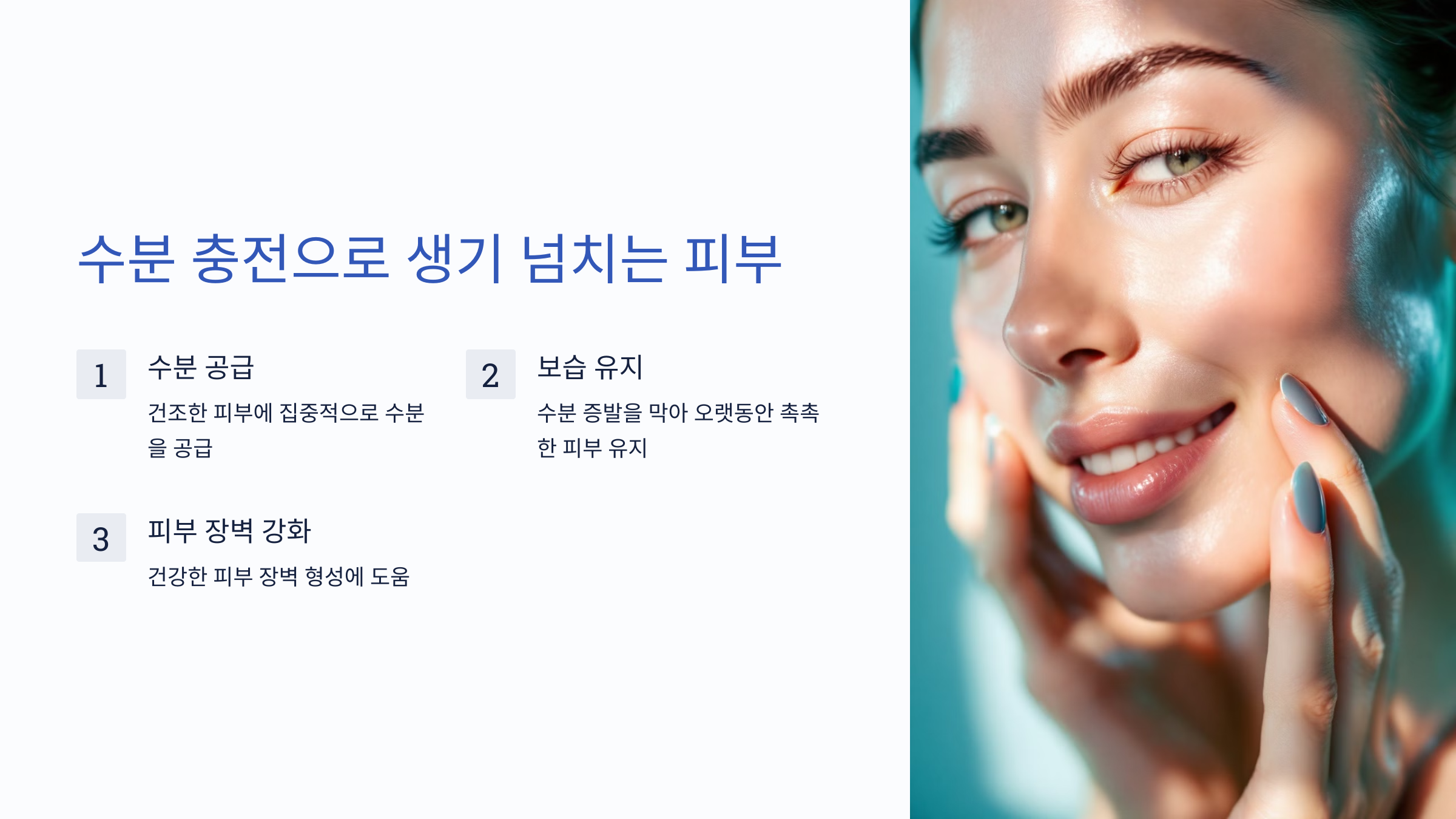 건조한 피부는 노화의 주요 원인 중 하나예요. 피부가 충분히 촉촉해야 탄력도 유지되고 잔주름도 줄어들어요. 수분 공급 세럼은 피부 장벽을 강화하고, 피부가 스스로 수분을 유지할 수 있도록 도와줘요.