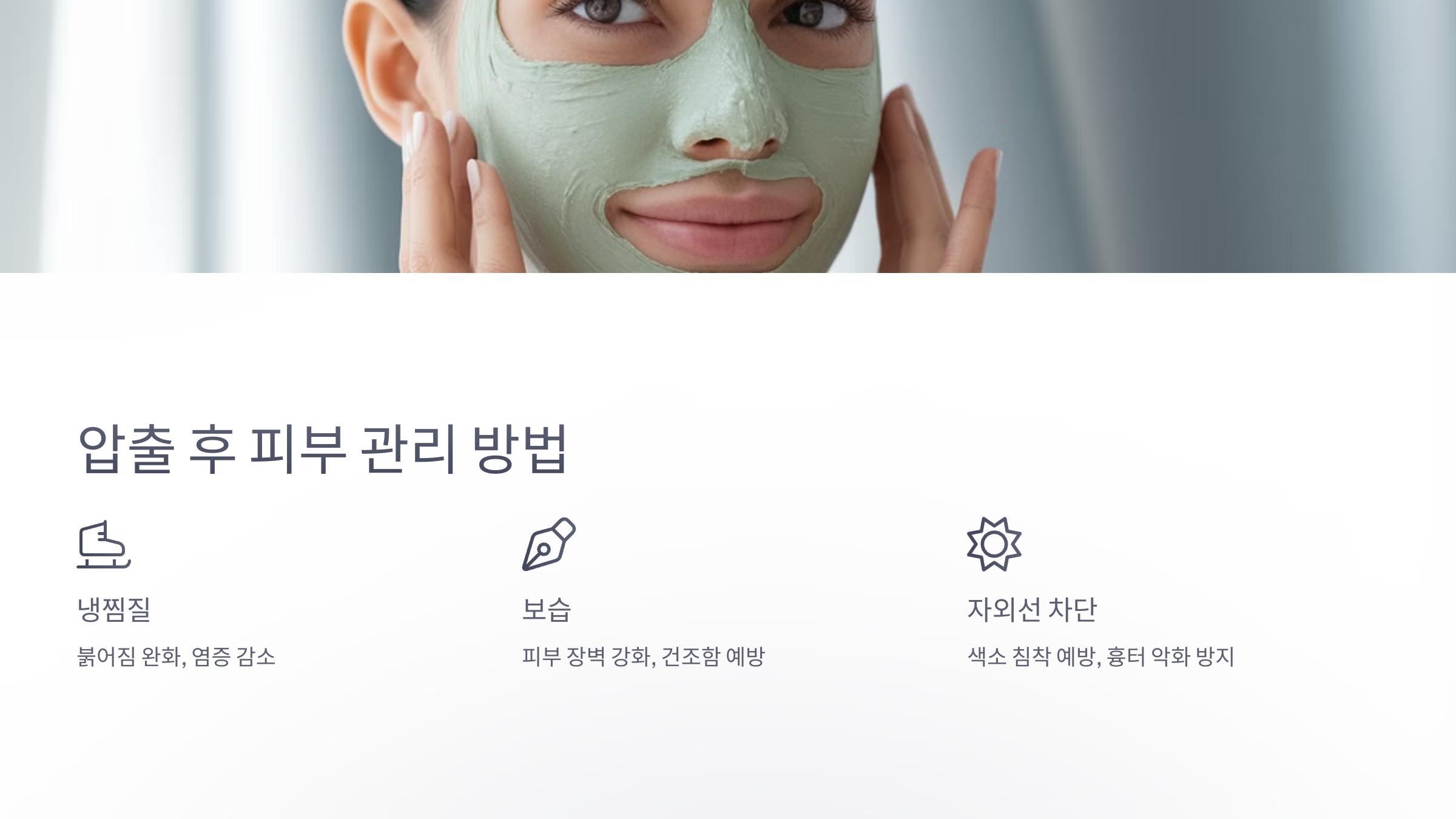 압출 후에는 피부가 민감하고 약해진 상태이기 때문에 특별히 신경 써야 해요. 첫째, 피부를 세안할 때 자극이 없는 클렌저를 사용하고, 미지근한 물로 가볍게 세안해요. 너무 차갑거나 뜨거운 물은 피해야 해요.