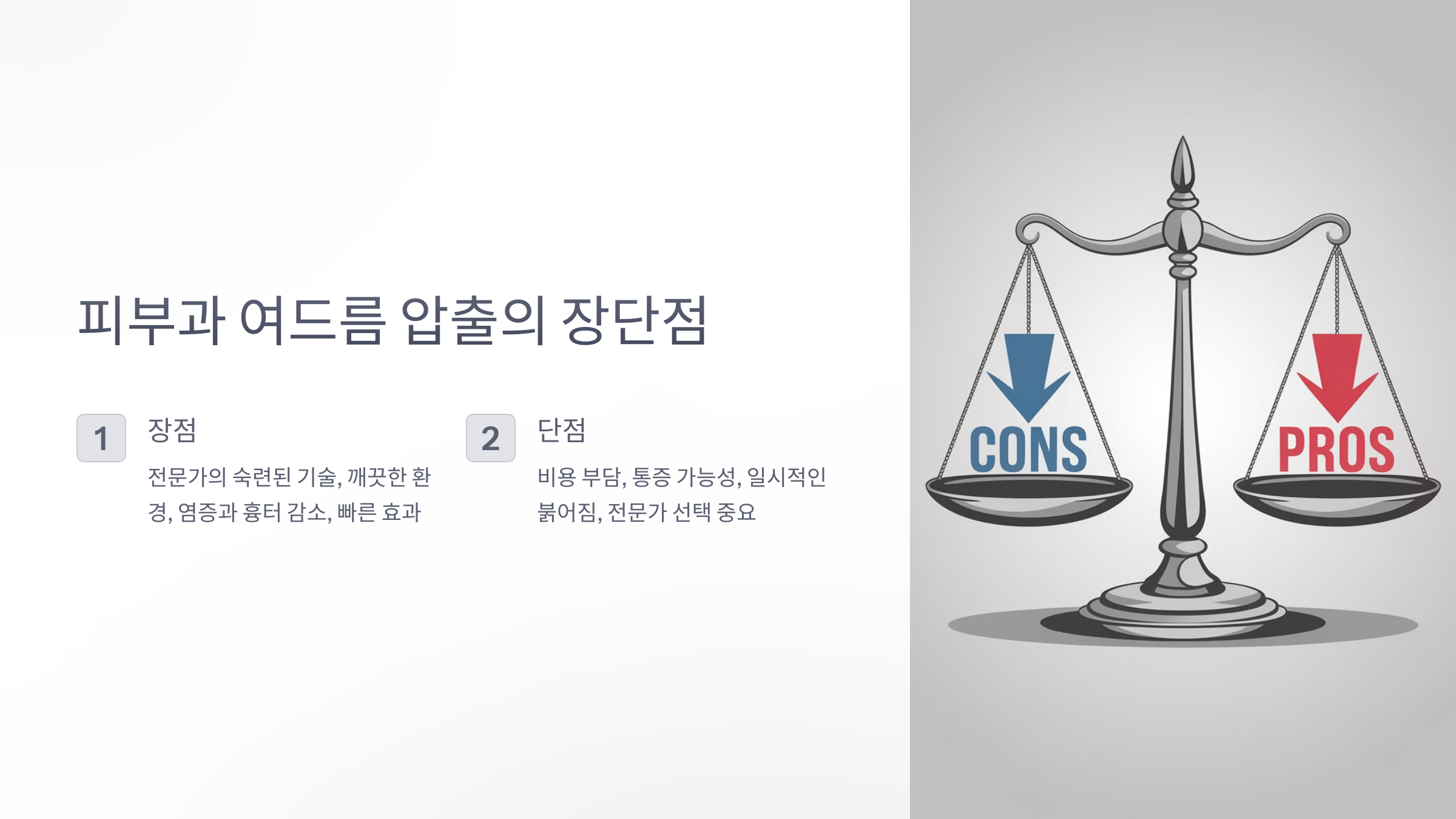장점 중 하나는 압출 시 모공 속 노폐물을 깨끗이 제거할 수 있어, 피부가 한층 깨끗하고 매끄러워진다는 점이에요. 특히 여드름 염증을 조기에 제거하면 흉터 발생 확률을 줄일 수 있어요. 또한 피부과에서는 살균된 도구를 사용하기 때문에 감염 위험이 낮아요.