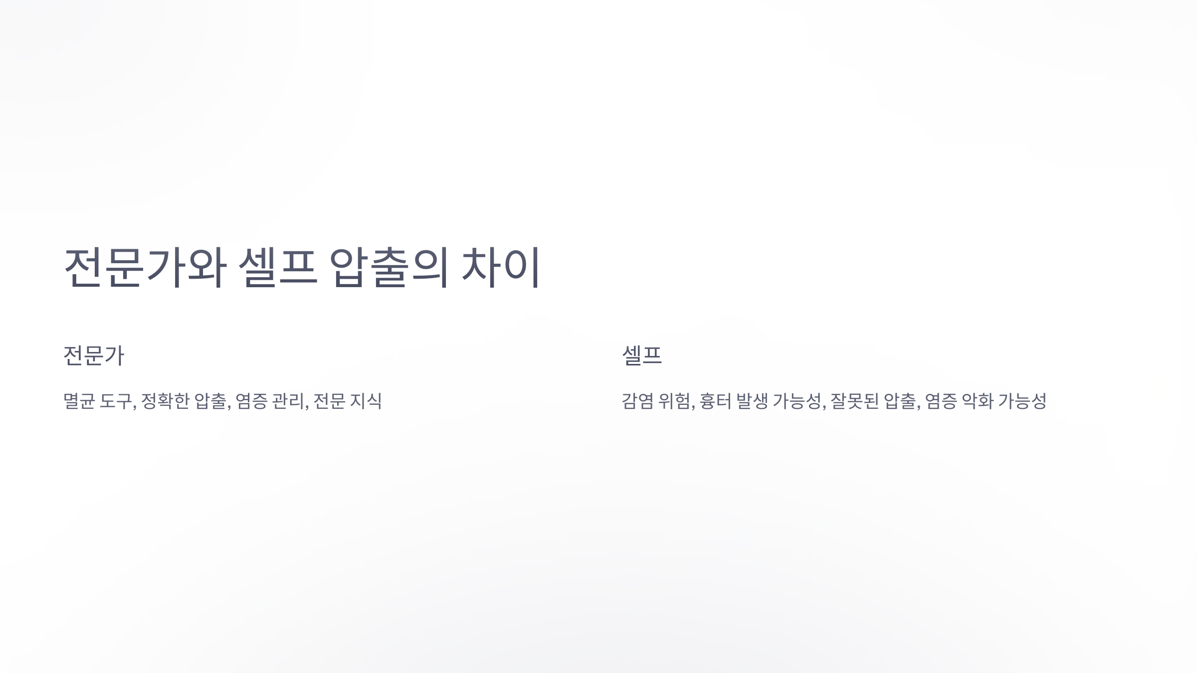 전문가와 셀프 압출의 가장 큰 차이는 경험과 전문 지식이에요. 전문가의 손길은 피부 상태를 정확히 진단하고, 치료 후 적절한 관리법까지 제안해주기 때문에 결과적으로 더 건강한 피부를 유지할 수 있게 해줘요.