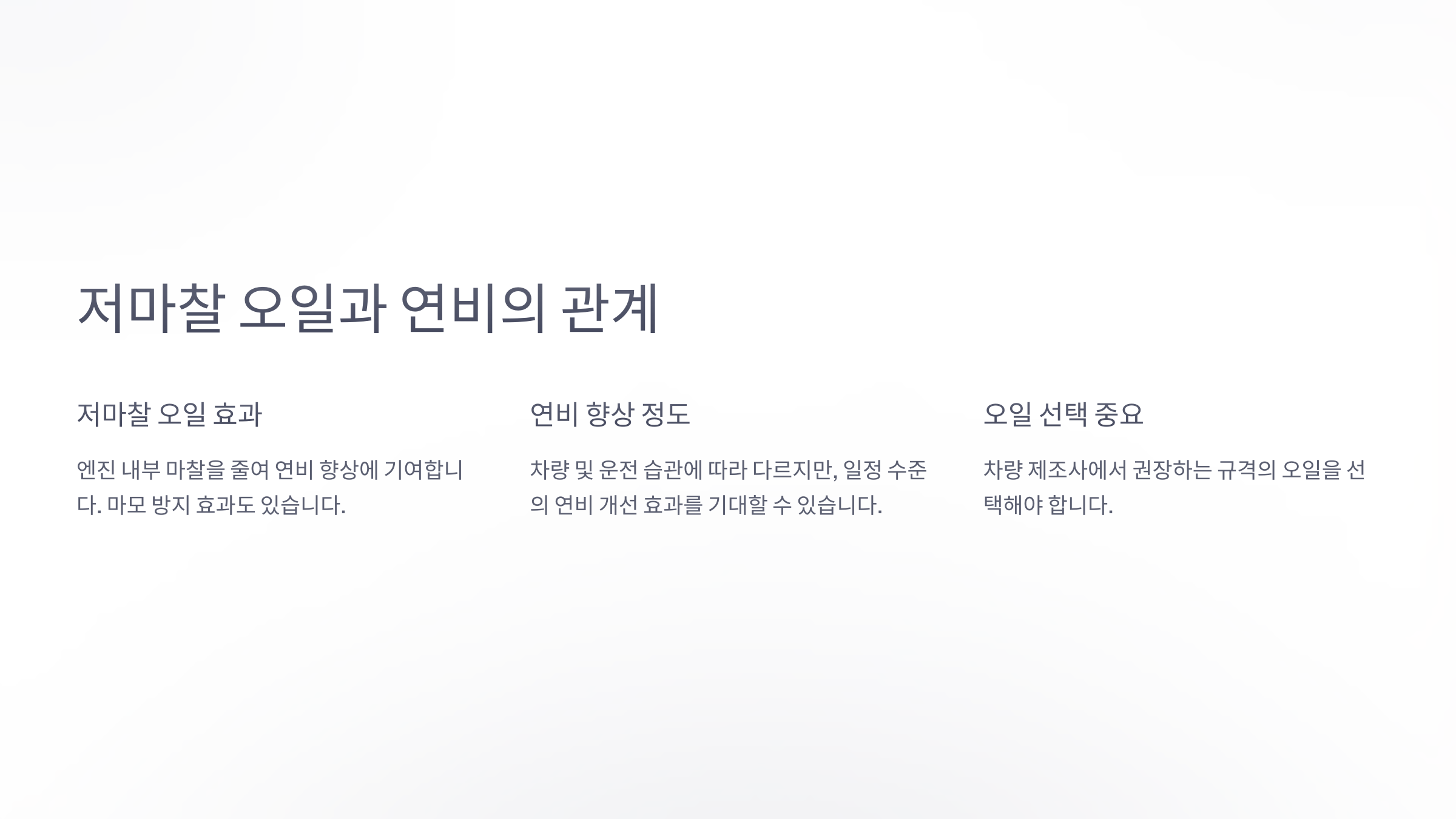연비 향상에 관심이 많다면 저마찰 엔진오일을 사용하는 것이 좋아요. 저마찰 오일은 내부 저항을 최소화해 엔진이 부드럽게 작동하도록 도와주고, 결과적으로 연료 소비를 줄이는 효과가 있어요.