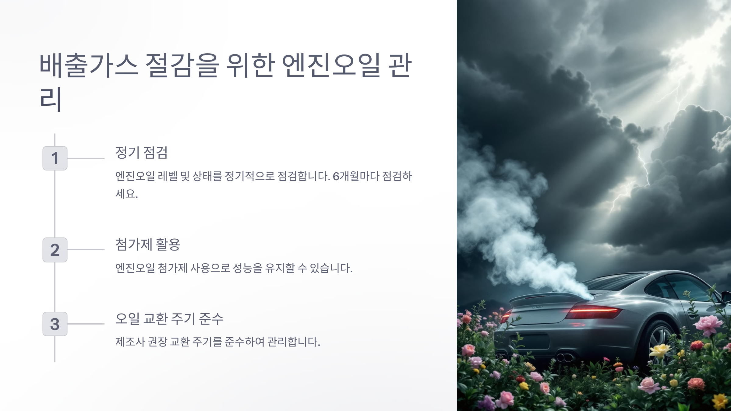 ♻️ 엔진오일 교환뿐만 아니라 **연료 시스템 청소, 공기 필터 교체** 등도 배출가스를 줄이는 데 큰 도움이 돼요. 작은 습관 하나가 환경 보호와 차량 성능 유지에 큰 역할을 한답니다! 🚗💚
