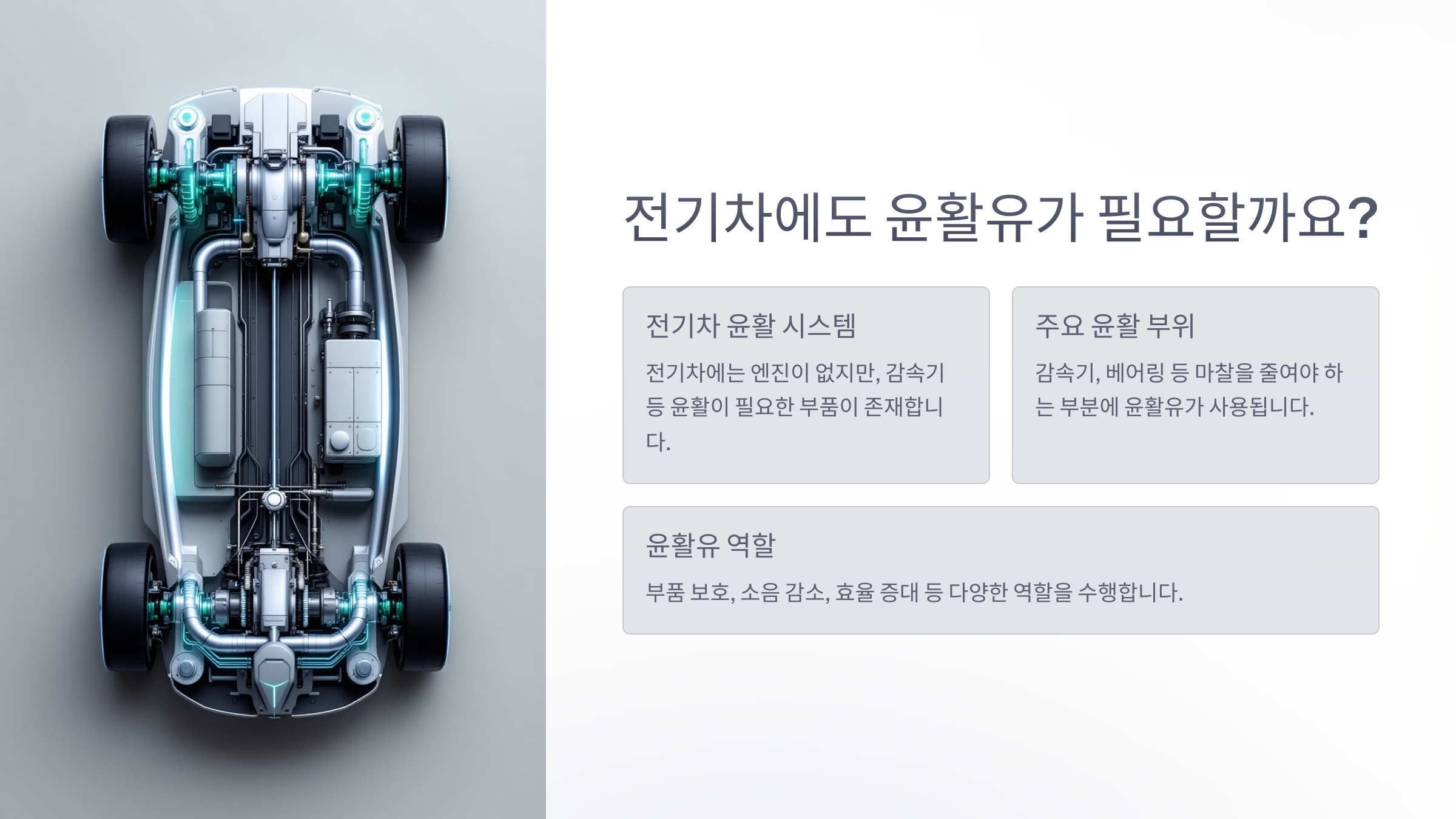 전기차는 엔진이 없기 때문에 일반적인 엔진오일을 사용할 필요가 없어요. 하지만 그렇다고 윤활유가 전혀 필요 없는 것은 아니에요. 전기차에도 변속기 오일, 감속기 오일, 냉각 시스템 윤활제가 필요하답니다.