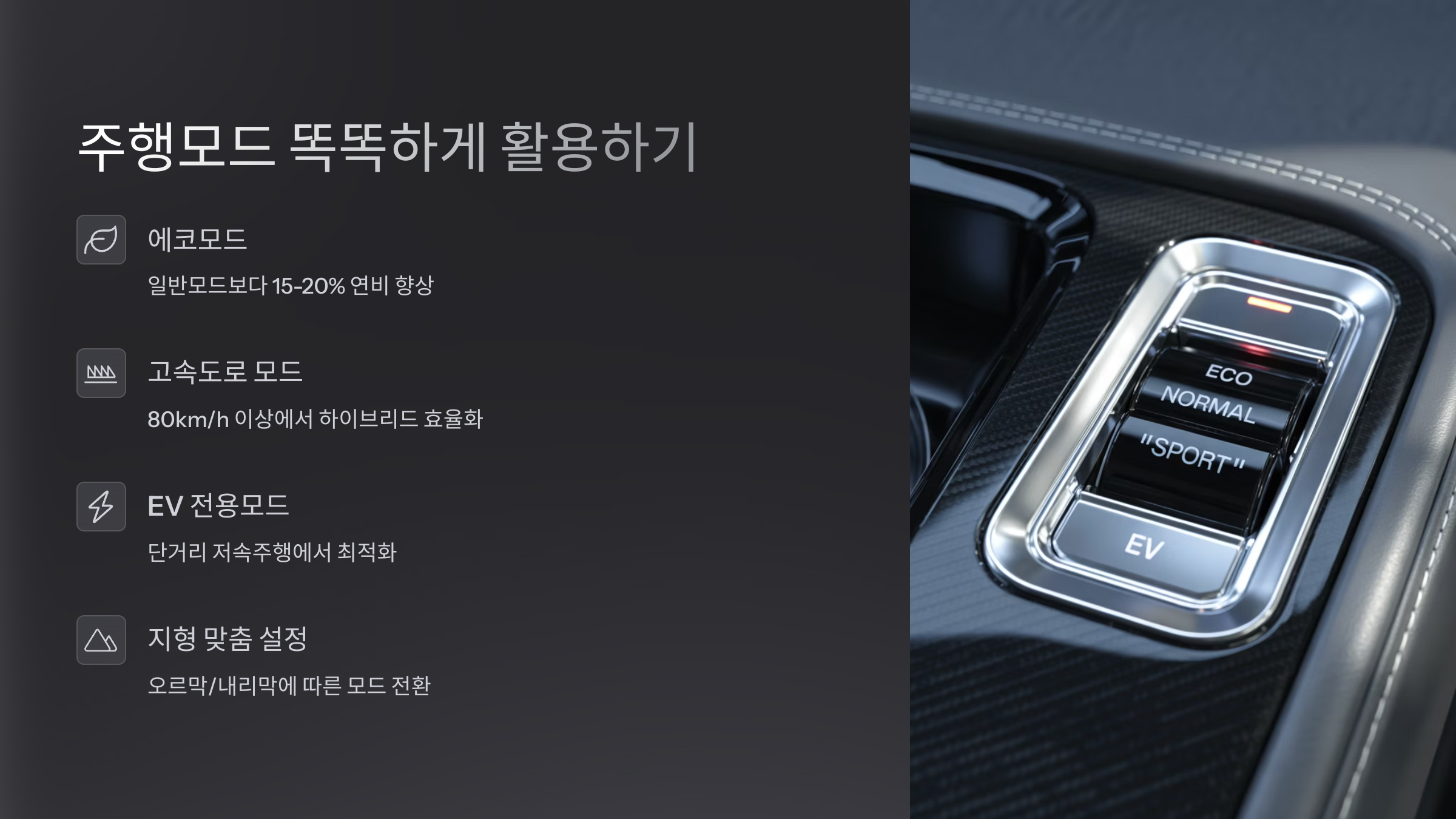 장거리 주행이나 고속도로에선 ECO 모드를 추천해요. 엔진과 모터의 협업을 가장 효율적으로 조절해 주는 모드로, 출력을 제한하면서도 연료를 적게 사용하도록 설계되어 있답니다.