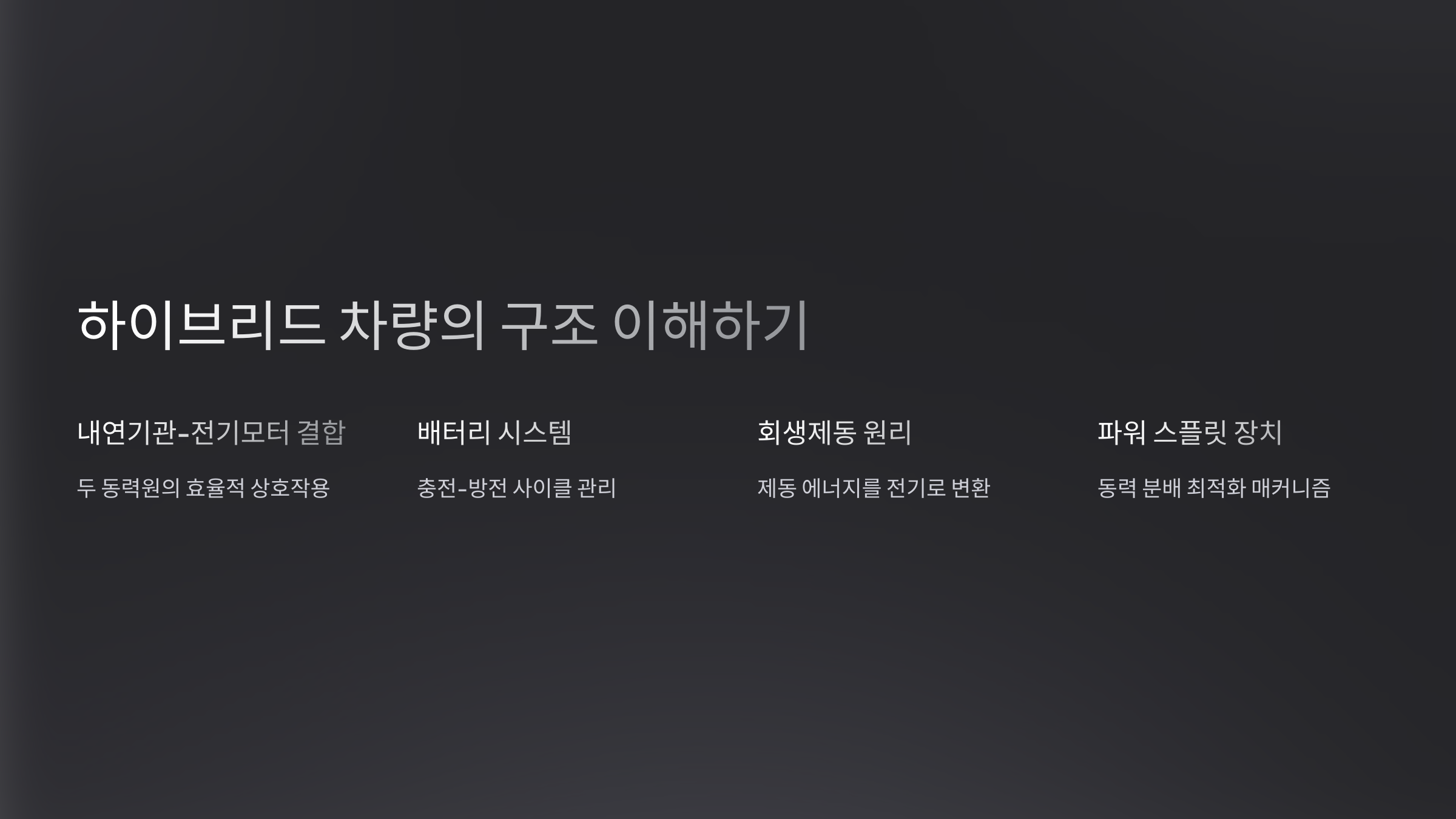 하이브리드 차량은 엔진과 모터, 그리고 배터리의 조화로 움직이는 스마트한 시스템이에요. 기본적으로 출발과 저속 주행 시에는 전기모터가 작동하고, 고속 주행 시에는 엔진이 함께 작동하면서 연비를 높이죠.