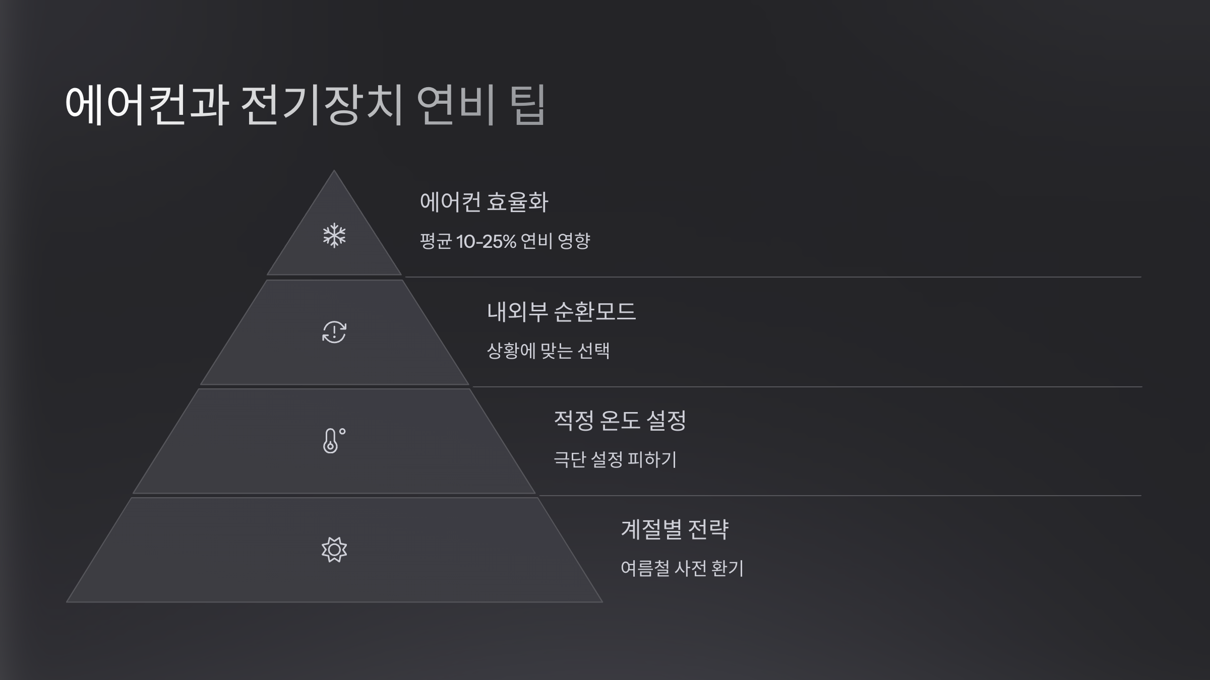 에어컨을 틀면 컴프레서가 작동하면서 전력 소모가 늘어나고, 그 전기를 공급하기 위해 엔진 개입이 잦아지게 돼요. 즉, 전기로 작동하는 시스템이라도 결국 기름값에 영향을 주게 되는 거예요.