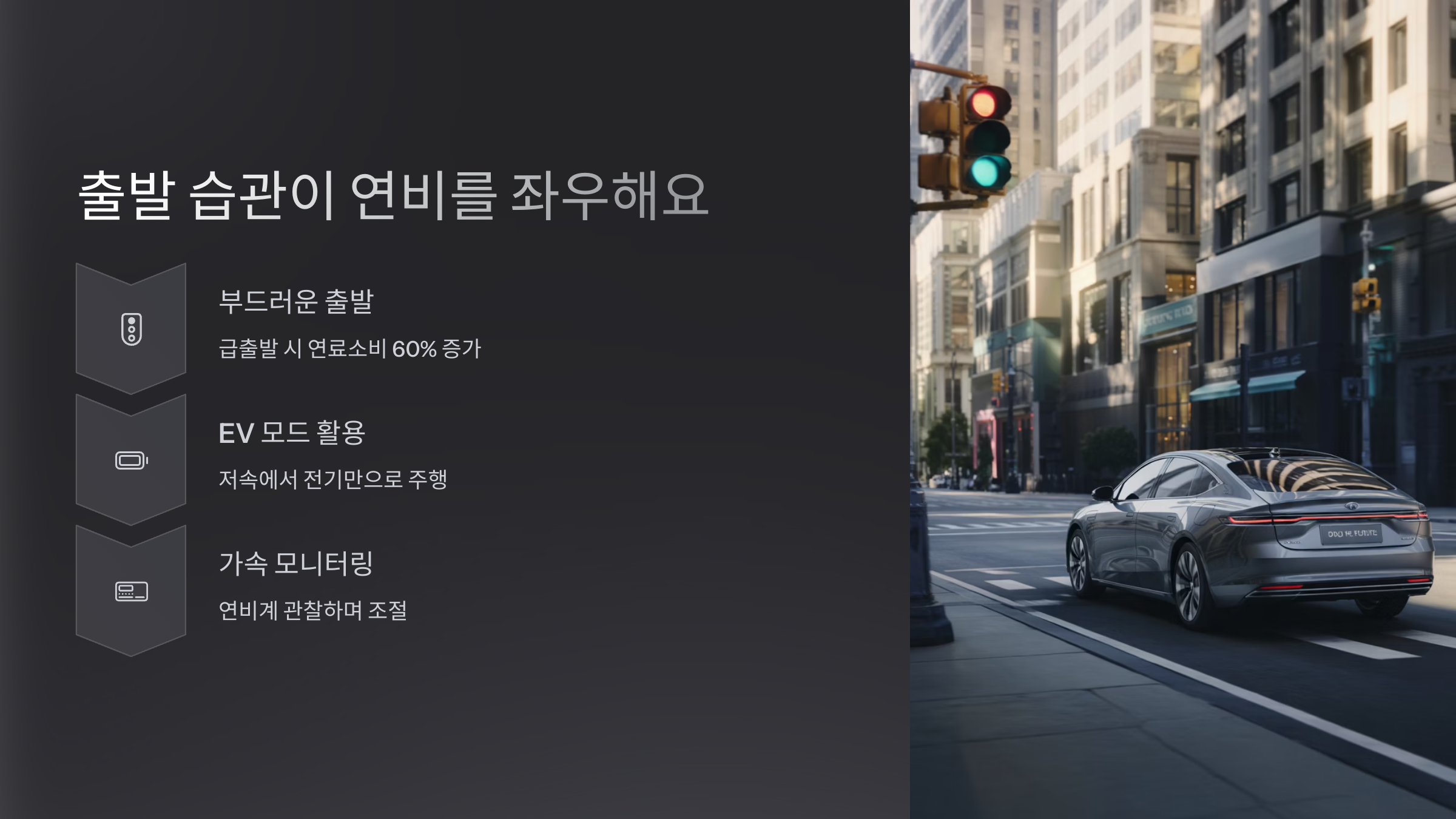 하이브리드 차량의 진정한 연비 절약은 출발할 때부터 시작돼요. 특히 전기모터는 저속에서 매우 효율적으로 작동하기 때문에, 출발 시 급가속만 피해도 연료를 많이 아낄 수 있어요.