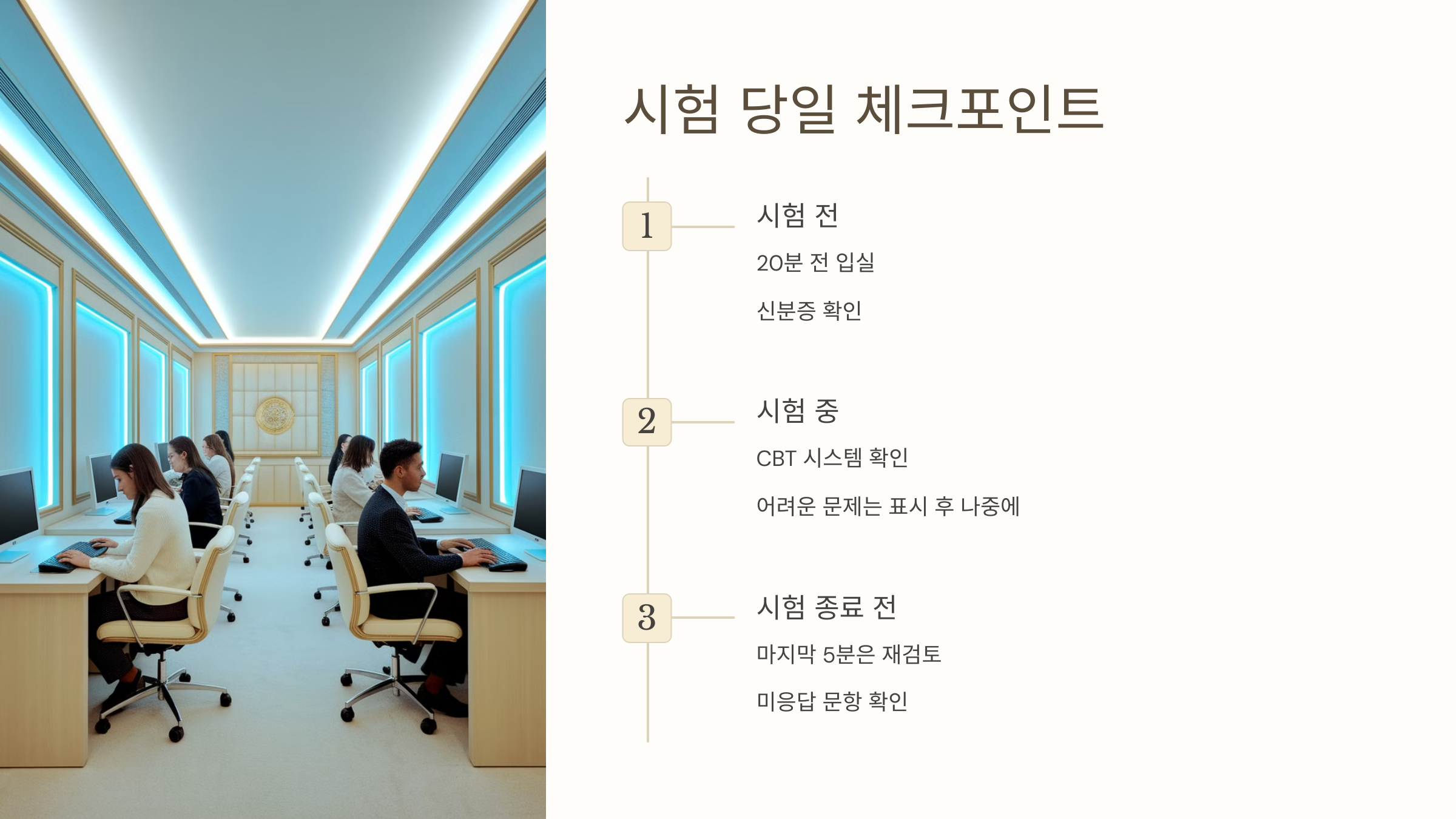 ✅ 시험장 도착 시간 시험은 CBT 시험장에서 진행되며, 최소 30분 전 도착을 추천해요. 입실 마감 이후에는 절대 입장이 불가하니 여유를 갖고 출발하세요.
