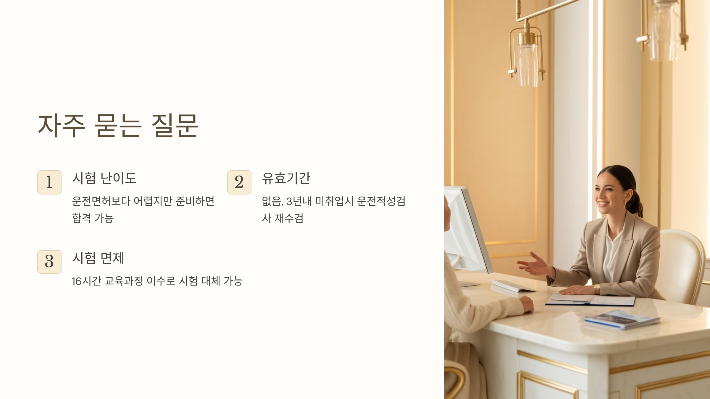A1. 만 20세 이상이고 1종 보통 또는 대형 면허 소지자라면 응시 가능해요!