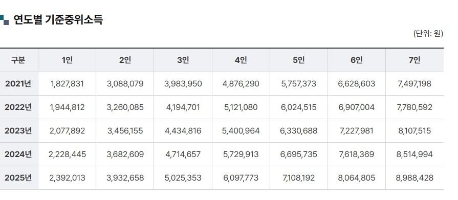 📌 2025년 중위소득 기준표