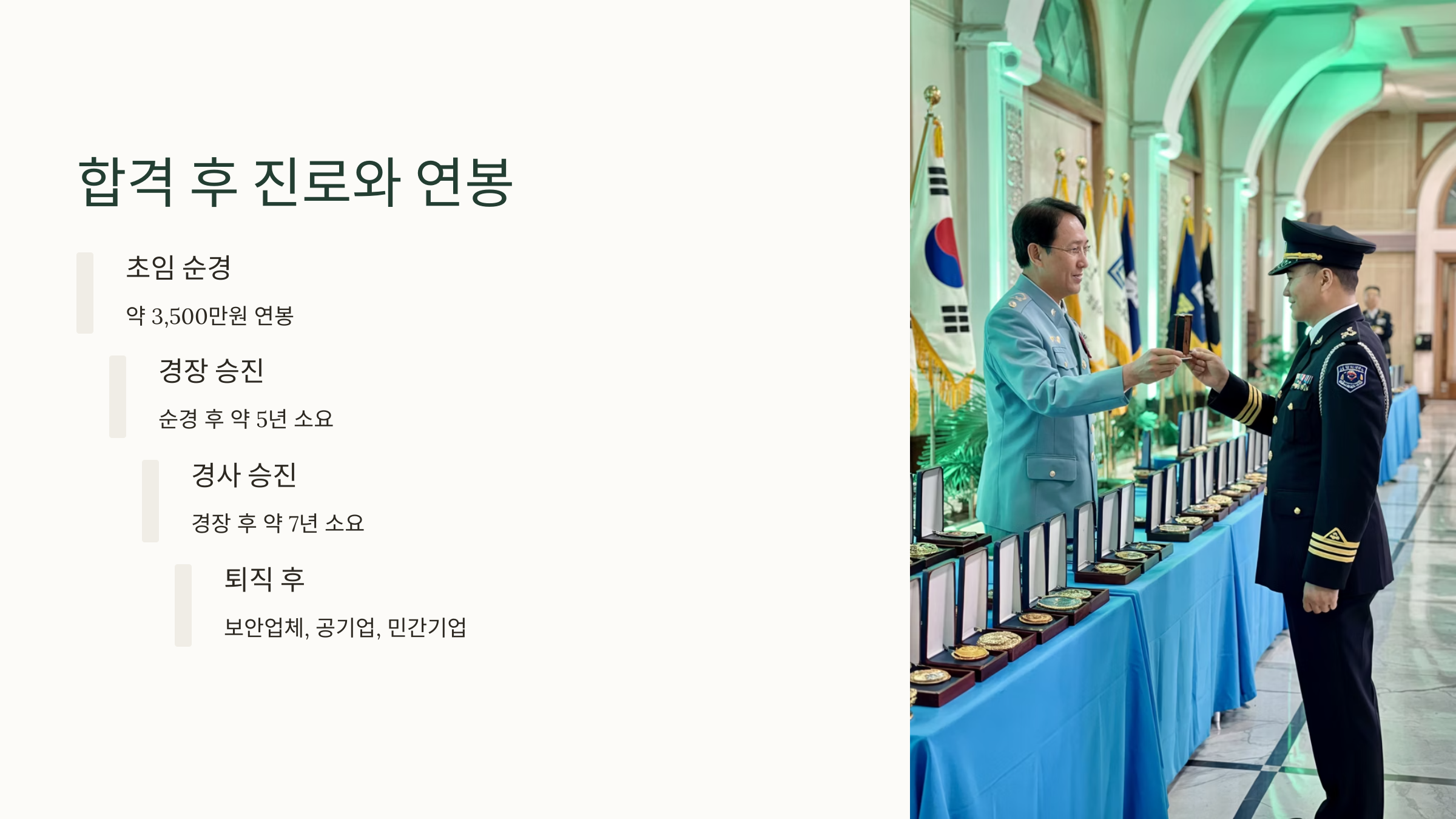 사회적 사명감, 체계적인 승진 시스템, 근무지 다양성, 그리고 점점 높아지는 봉급과 처우까지 경찰은 지금 가장 주목받는 직업 중 하나랍니다.