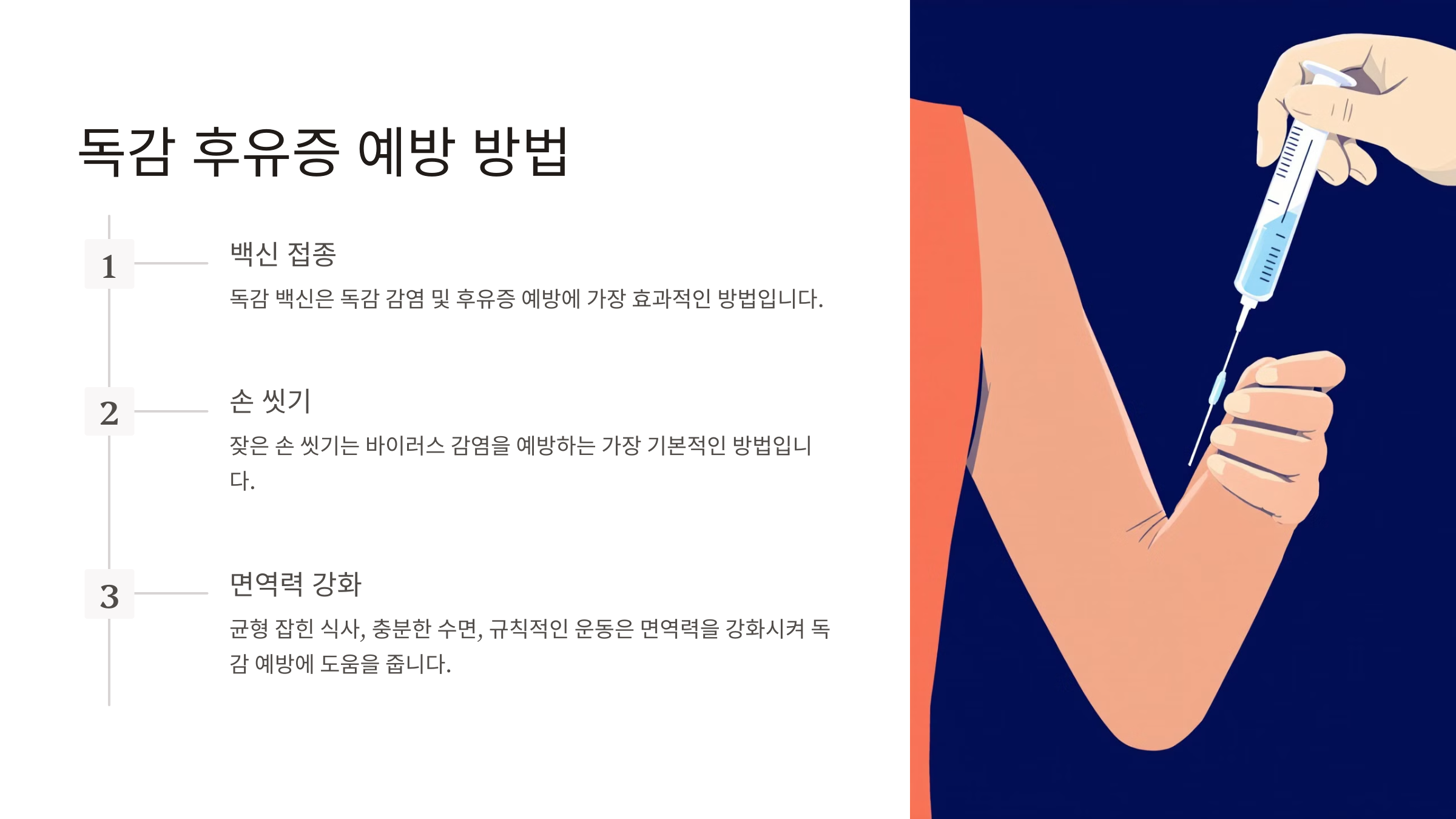 그리고 무엇보다 충분한 수면이 필요해요. 수면은 면역 시스템 회복에 가장 중요한 요소 중 하나예요. 하루 7~8시간 정도의 양질의 수면을 유지하는 것이 독감 후유증 예방에 효과적이에요.