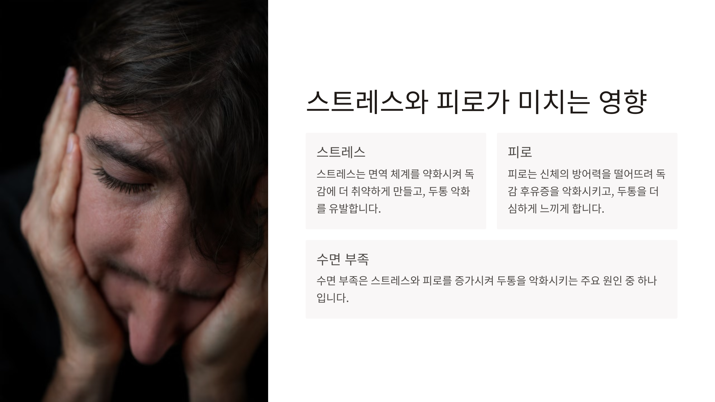스트레스와 피로는 독감 후 두통을 악화시키는 주요 요인이에요. 독감으로 인해 체력이 약해지면 평소보다 더 쉽게 스트레스를 느끼게 되고, 이는 두통으로 이어질 가능성을 높여요. 특히 만성 스트레스는 뇌 신경을 과도하게 자극할 수 있어요.