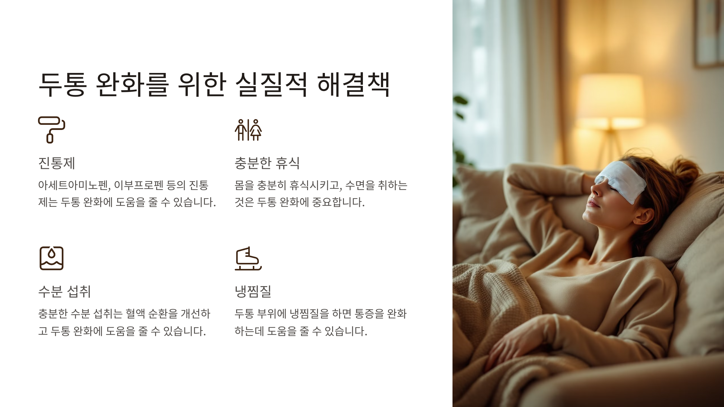 독감 후 두통을 완화하려면 생활습관을 개선하고 적절한 치료법을 병행하는 것이 중요해요. 우선, 충분한 수분 섭취를 통해 탈수를 방지해야 해요. 물을 자주 마시는 습관은 뇌 혈류를 개선하고 두통을 완화하는 데 도움을 줘요.