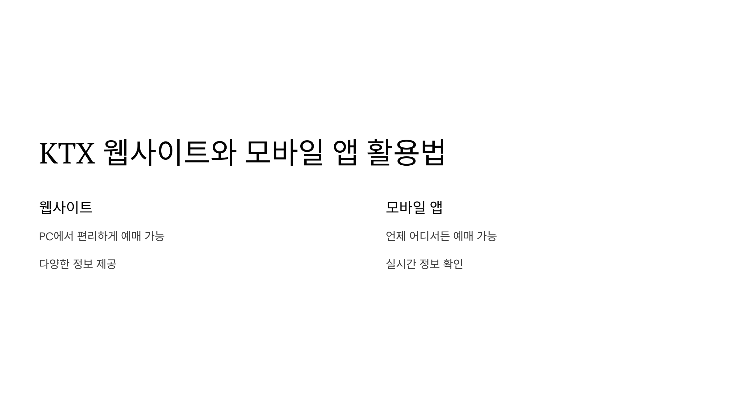 코레일 웹사이트는 대화면으로 여러 옵션을 한눈에 확인할 수 있는 장점이 있어요. 그룹 여행을 준비하거나 추가적인 서비스 정보를 확인하고 싶다면 웹사이트 활용이 더 적합할 수 있어요. 예를 들어, 열차 운행 시간표 다운로드나 정기권 구입 같은 기능은 웹사이트에서 더 간편해요.