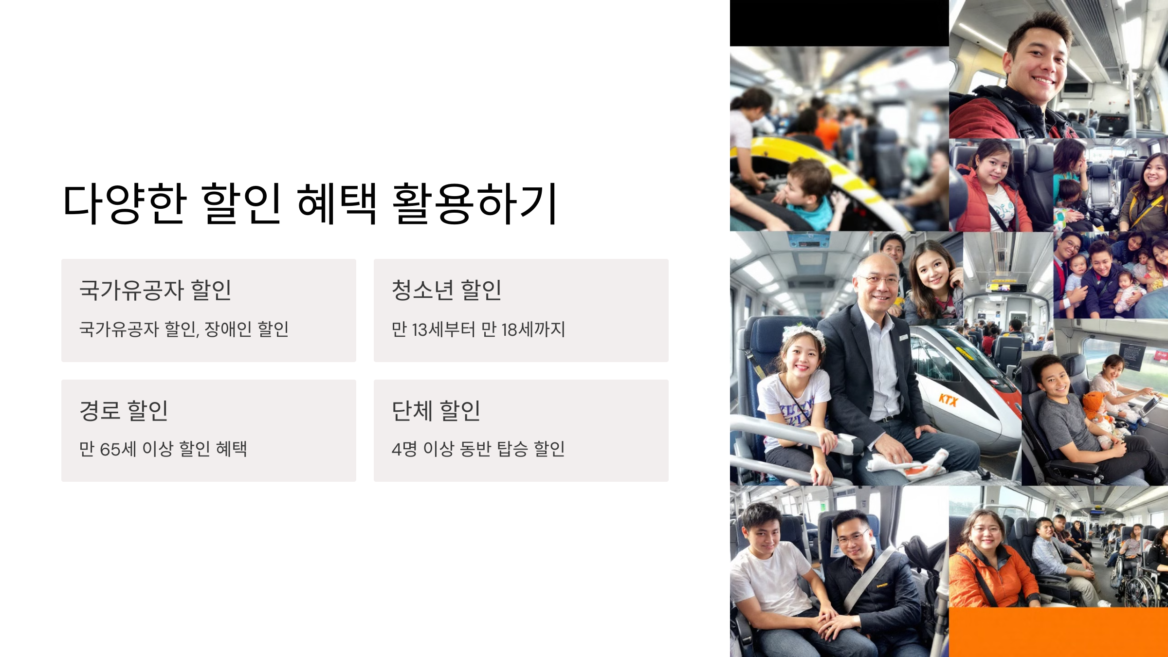 A2. 청소년 드림, 다자녀 행복 할인 등 다양한 할인이 있어요. 조기 예약과 코레일 멤버십 포인트도 놓치지 마세요.
