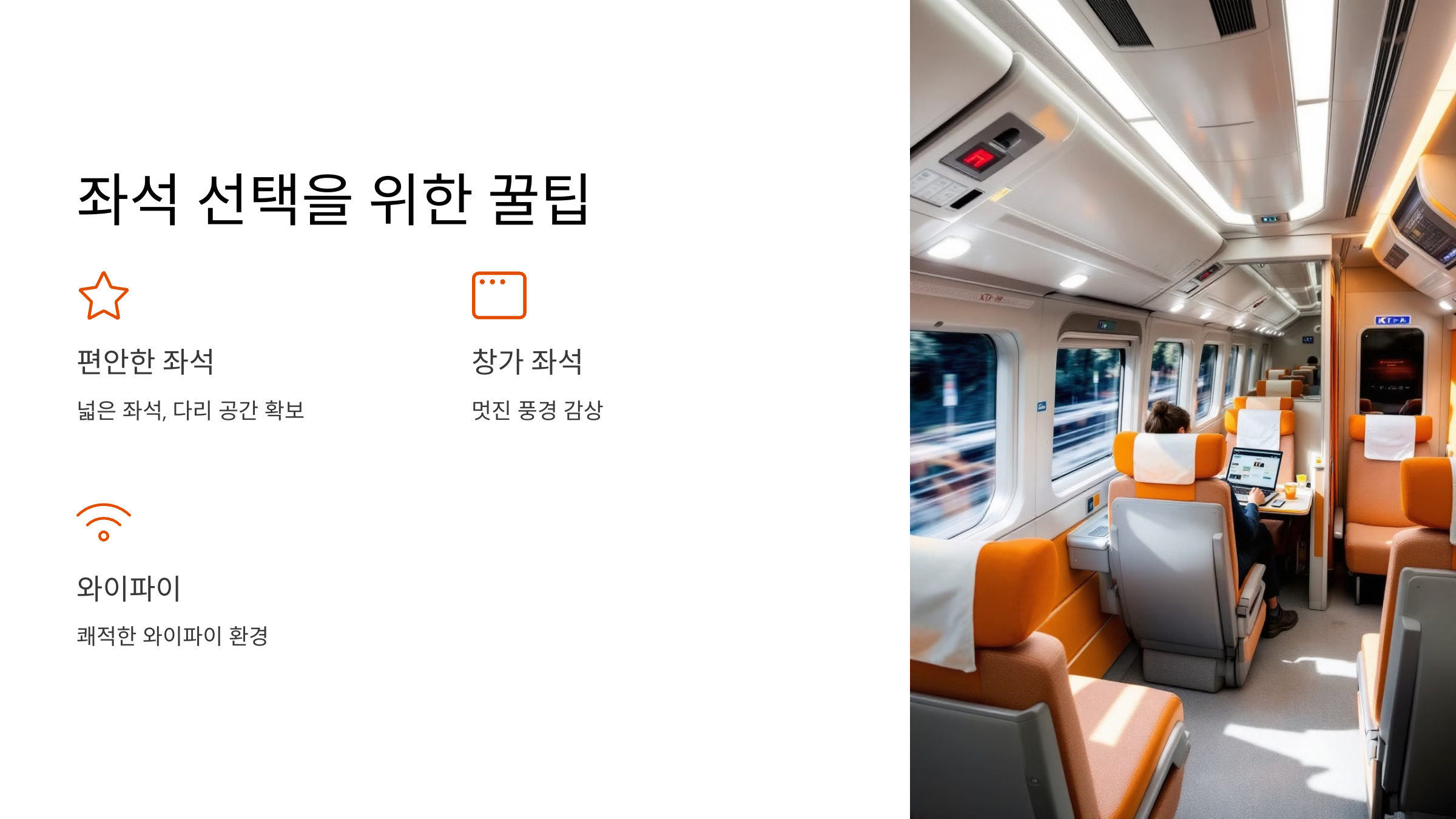 예매 시에는 일반실과 특실, 그리고 좌석의 방향(순방향/역방향)을 선택할 수 있어요. 특실은 더 넓고 편안한 좌석을 제공하지만 요금이 일반실보다 비싸니, 여행 목적과 예산에 따라 적절히 선택하는 것이 중요해요.